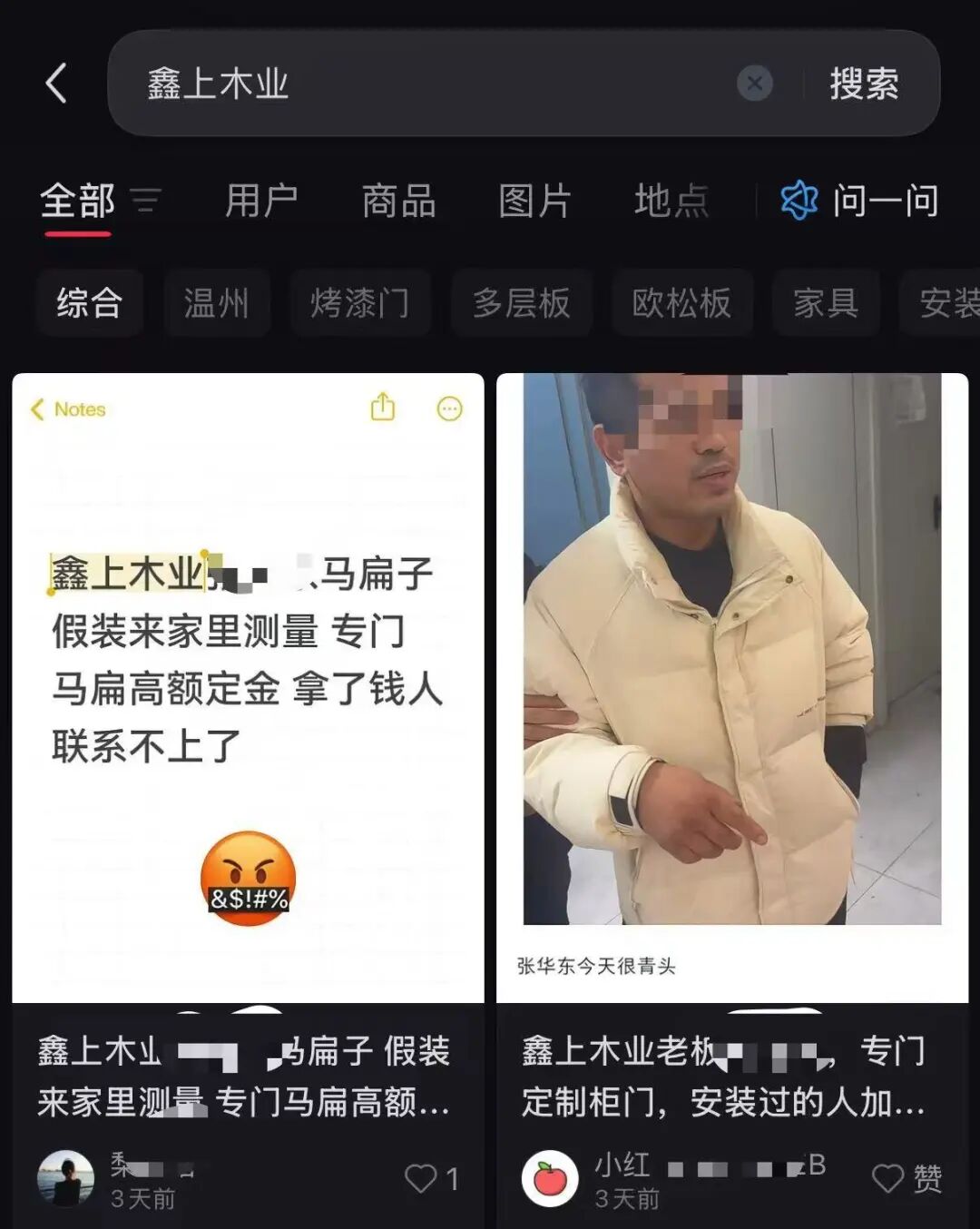 不少受害者都是通过线上社交平台了解到鑫上木业,看着对方发布的柜门、房门等产品帖子,满心欢喜下了单、付了定金,没想到最终落得“钱货两空”的结局。