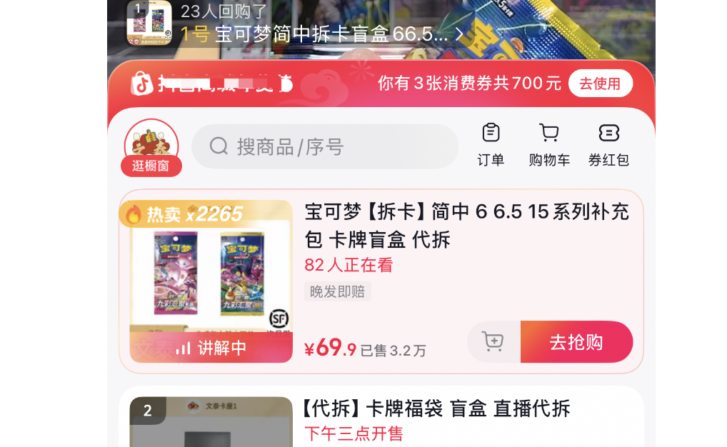 在一位宝可梦卡牌玩家的指引下,记者又找到“文泰卡屋”直播间。和多数直播间39.9元一抽的定价不同,这里单抽价格高达69元。直播间在线人数在100人左右,氛围格外热烈,每次上架卡牌盲袋,都能在几秒内被一抢而空,速度快得让人来不及反应。记者多次盯着商品上架提醒点击下单,均因手速不及未能抢到。记者观察发现,不少老玩家出手阔绰,一次下单二三十包是常事,评论区里还会分享自己的中奖情况,俨然形成了固定的参与群体。