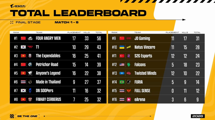 浅陋望望决赛第一天适度后的积分排行情况,4AM仍旧以56分的获利暂居第一,第二名是43分的T1,TE在吃鸡后以41分位列第三,后续是39分的PeRo,38分的AL,37分的MITH,32分的DNS和FCE,31分的JDG跌至第九名。