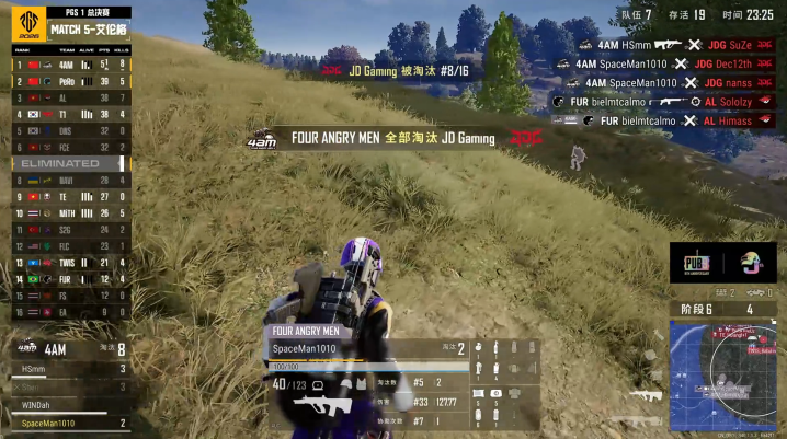 这把放工局圈形偏左,JDG开局拿下一血,PeRo分踩的房区遭到FCE两东说念主的冲点,由于解救太慢加上后续互助拉跨,这波硬是被对面换了2个,原来G村的点位被其他队伍有隙可乘,PeRo只可去圈外回生队友。阶段4蓝圈削弱,在房区埋点的4AM比及了FS拿下3分,看到5圈刷新后4AM拉出房区反卡圈外的队伍,JDG冲破悲怆只可绕路,但如故被4AM高打低淘汰出局。