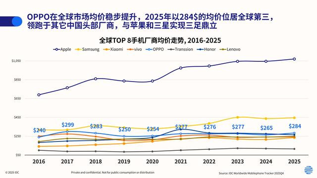 [环球网科技概括报说念]4月17日,国际数据公司(IDC)发布最新数据清醒,OPPO在世界高端智高东说念主机阛阓一经站稳第一阵营:2025年,OPPO在世界500–550好意思元价钱段份额位列第一,ASP(平均销售单价)达284好意思元。