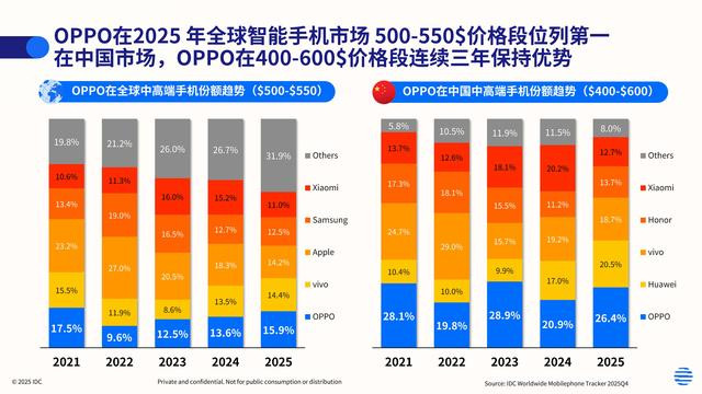 500–550好意思元是世界智高东说念主机阛阓公认的"高端进口"价钱带,是所有手机厂商的必争之地。IDC数据清醒,2025年OPPO在这一价钱段的世界阛阓份额已稳居行业第一。