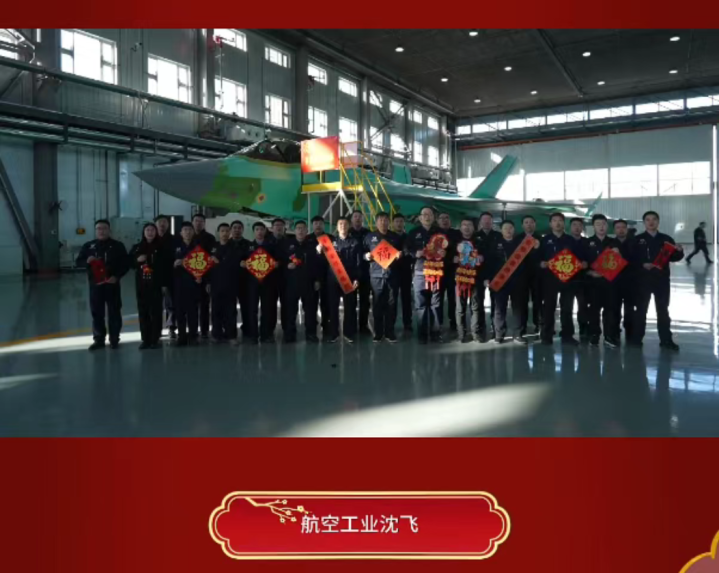 沈飞公司,有26名责任主谈主员,也身着调处的工装,或手抓“福”字,或手拿横幅,排成两行队列,站在总装厂房内的一架绿皮版——歼35舰载构兵机(机头左侧面的登机梯舱盖清楚可见),也给寰宇东谈主民硬核贺年。