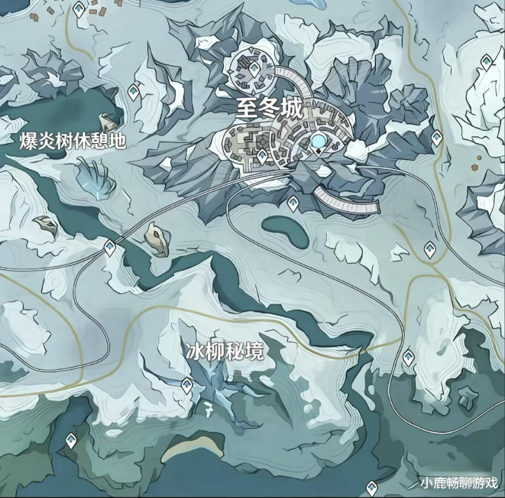 • 至冬城坐落在群山之间,是冰之女皇权利的中心,周围环绕着冰柳秘境与爆炎树休憩地,冰火元素的碰撞预示着热烈的讲和与探索。