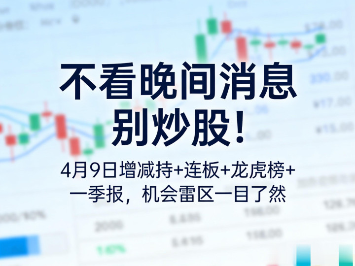 多类消断交汇碰撞,契机与风险同步流露,稍有失慎就容易踩中减持雷区,错过功绩增长与资金聚焦的优质地点。4月9日晚间A股音问面干货密集开释,涵盖增减持公告、东谈主气连板梯队、龙虎榜资金流向、一季报功绩预报四大中枢板块,每一条信息皆和散户日常投资息息干系。